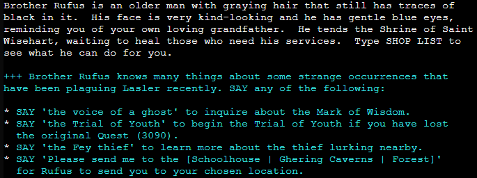 Visit Master Irvin for two quests to complete in Lasler. Irvin is located, from recall at the Shrine of St. Wisehart, move west, north, 4 west, open north, 2 north, open east, east into Irvin’s office. Irvin asks you to run two errands for him. SAY ERRAND 1 to receive the first errand from Irvin.